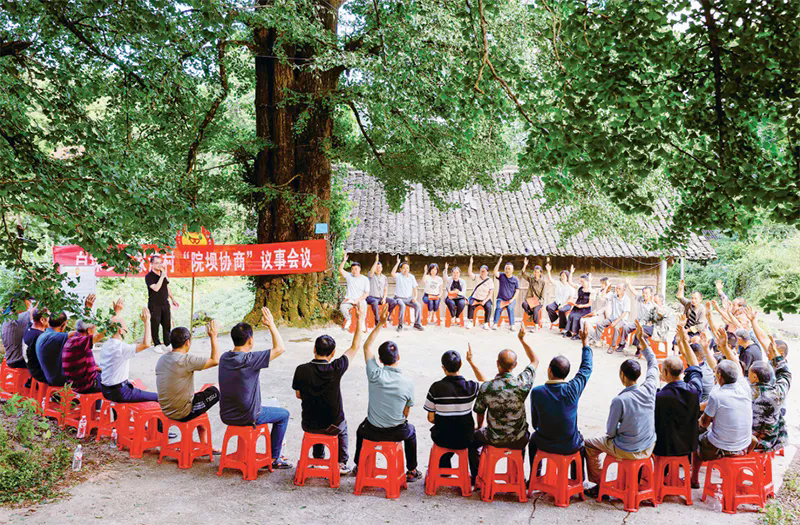 近年來(lái),貴州省黔東南苗族侗族自治州施秉縣政協(xié)以“有事好商量,眾人的事情眾人商量”為理念,在群眾家門(mén)口搭建“開(kāi)展院壩協(xié)商·建設(shè)和美鄉(xiāng)村”協(xié)商議事平臺(tái),推動(dòng)民主協(xié)商向基層延伸。圖為2024年7月4日,在施秉縣白垛鄉(xiāng)石家灣村,縣政協(xié)委員、村“兩委”成員、村民代表圍繞移風(fēng)易俗、美化環(huán)境、保護(hù)生態(tài)、助力和美鄉(xiāng)村建設(shè)開(kāi)展協(xié)商。 人民圖片 磨桂賓/攝