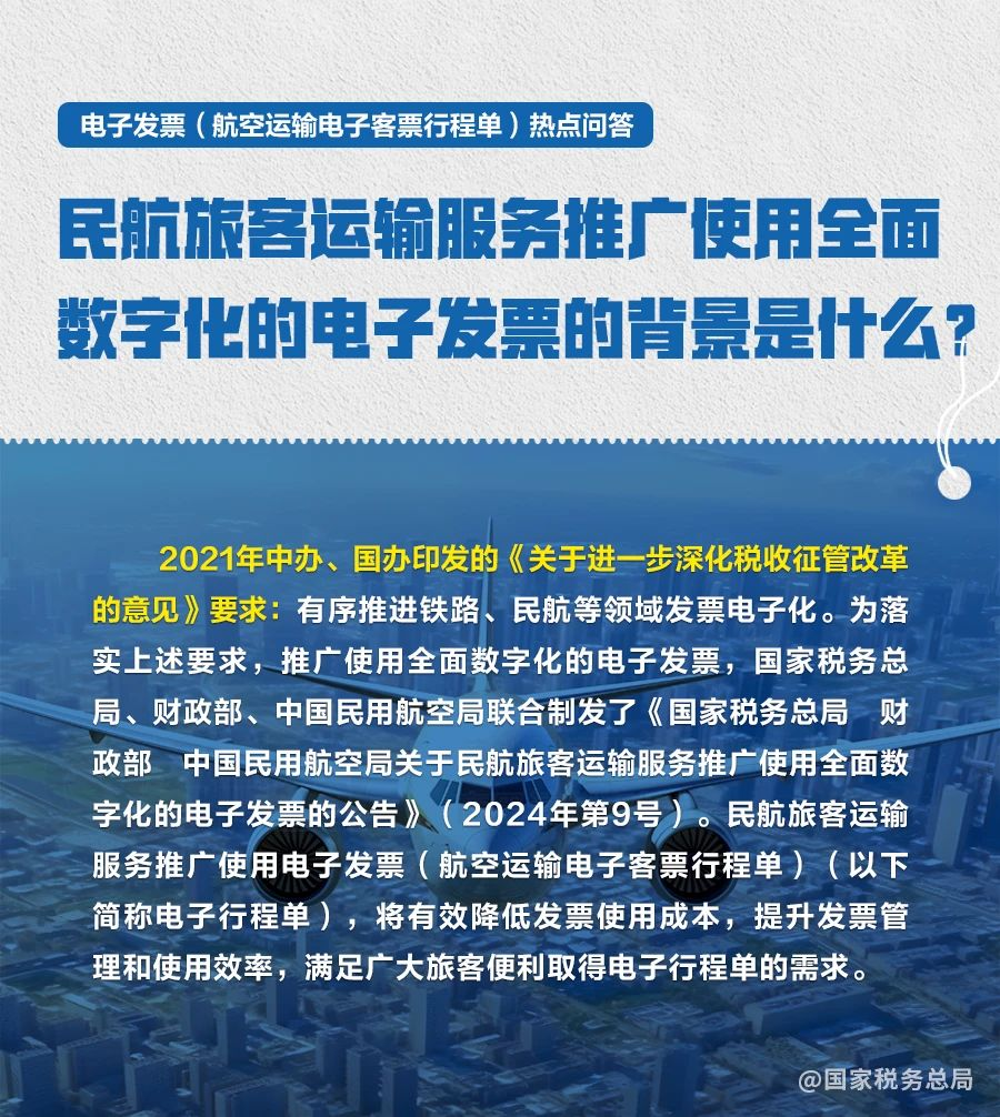 日前,國(guó)家稅務(wù)總局、財(cái)政部、中國(guó)民用航空局聯(lián)合發(fā)布《關(guān)于民航旅客運(yùn)輸服務(wù)推廣使用全面數(shù)字化的電子發(fā)票的公告》,明確自2024年12月1日起,在我國(guó)民航旅客運(yùn)輸服務(wù)領(lǐng)域推廣使用全面數(shù)字化的電子發(fā)票——電子發(fā)票(航空運(yùn)輸電子客票行程單)。相關(guān)熱點(diǎn)問答如下: