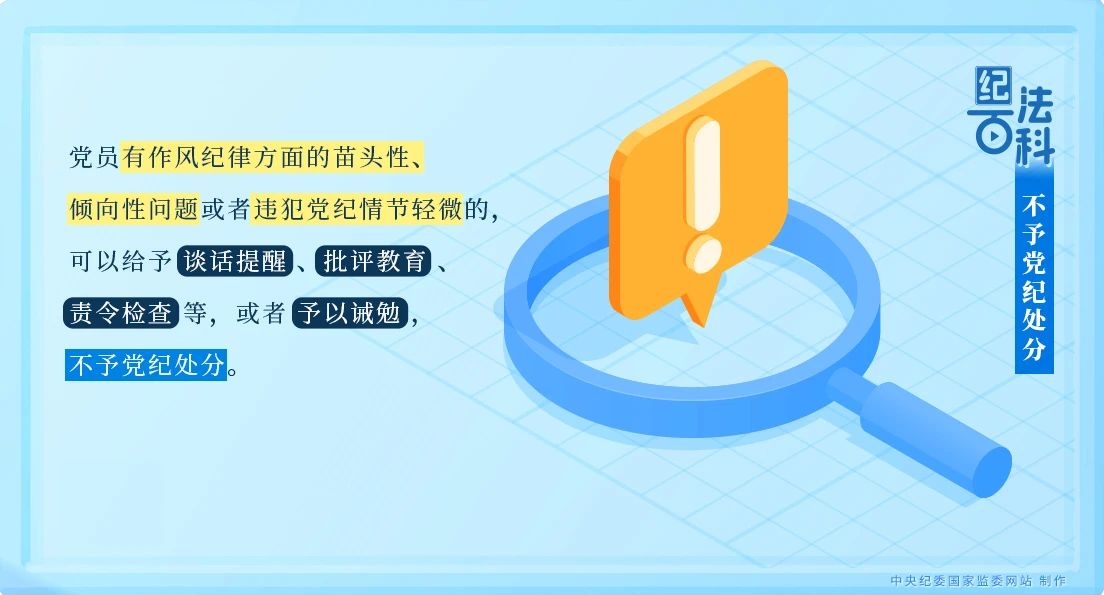 《中國(guó)共產(chǎn)黨紀(jì)律處分條例》第十九條第二款規(guī)定:黨員有作風(fēng)紀(jì)律方面的苗頭性、傾向性問(wèn)題或者違犯黨紀(jì)情節(jié)輕微的,可以給予談話提醒、批評(píng)教育、責(zé)令檢查等,或者予以誡勉,不予黨紀(jì)處分!