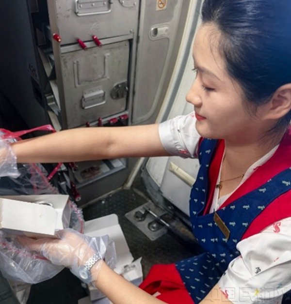 乘務(wù)員張涵立刻安撫道:“您別著急,我馬上回服務(wù)間的餐車內(nèi)給您找。”她迅速回到后艙服務(wù)間在收完餐的餐車中仔細(xì)翻找,逐一查看收回的餐盒,生怕有任何的遺漏。